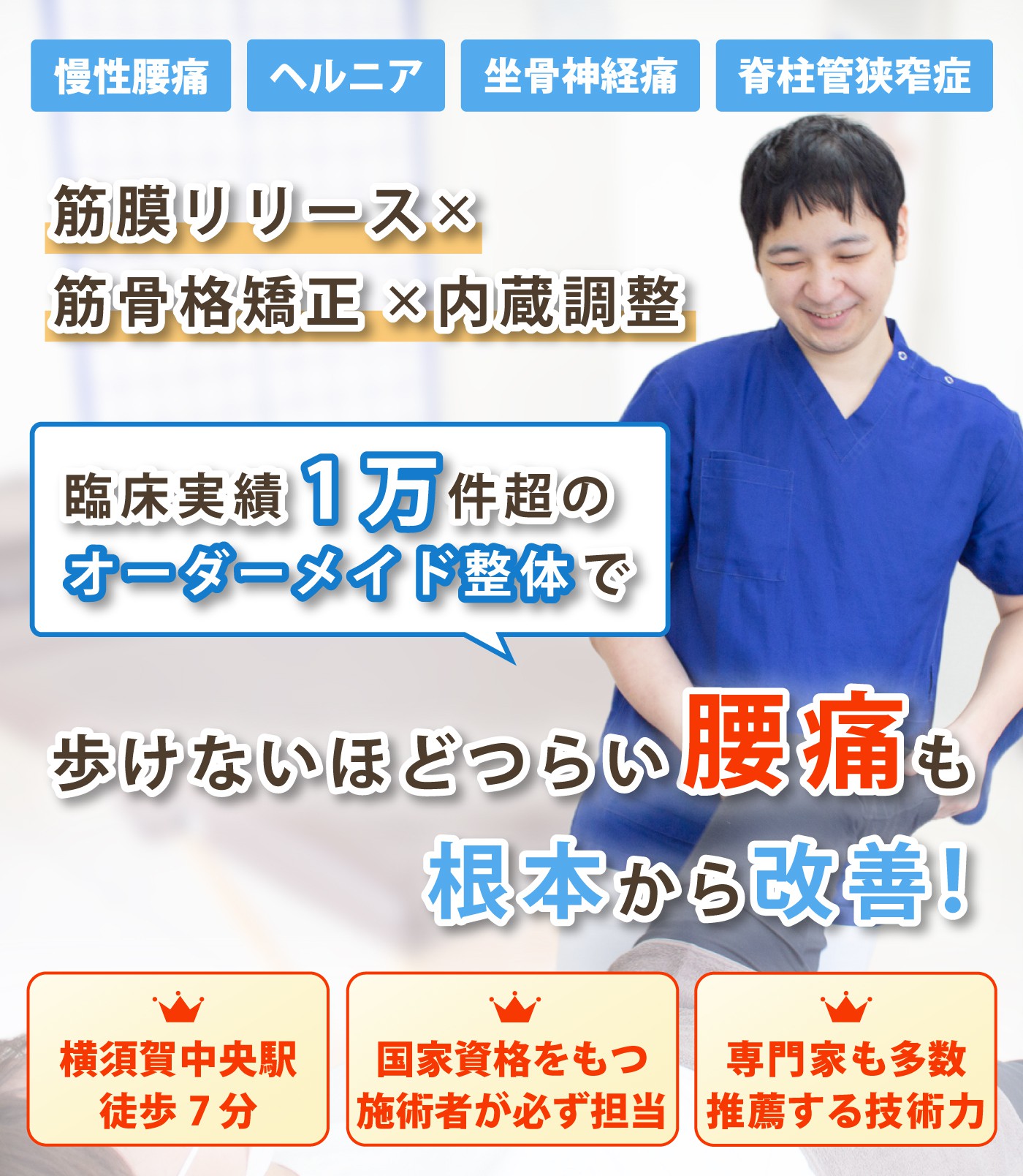 慢性的な腰痛、椎間板ヘルニア、ぎっくり腰、坐骨神経痛など腰痛の経験施術が豊富な整体院です。施術して終わりではなく、その後の自宅でできるセルフストレッチや生活習慣の指導もいたします。